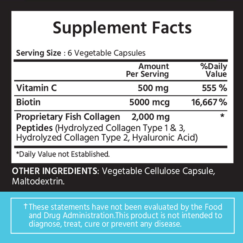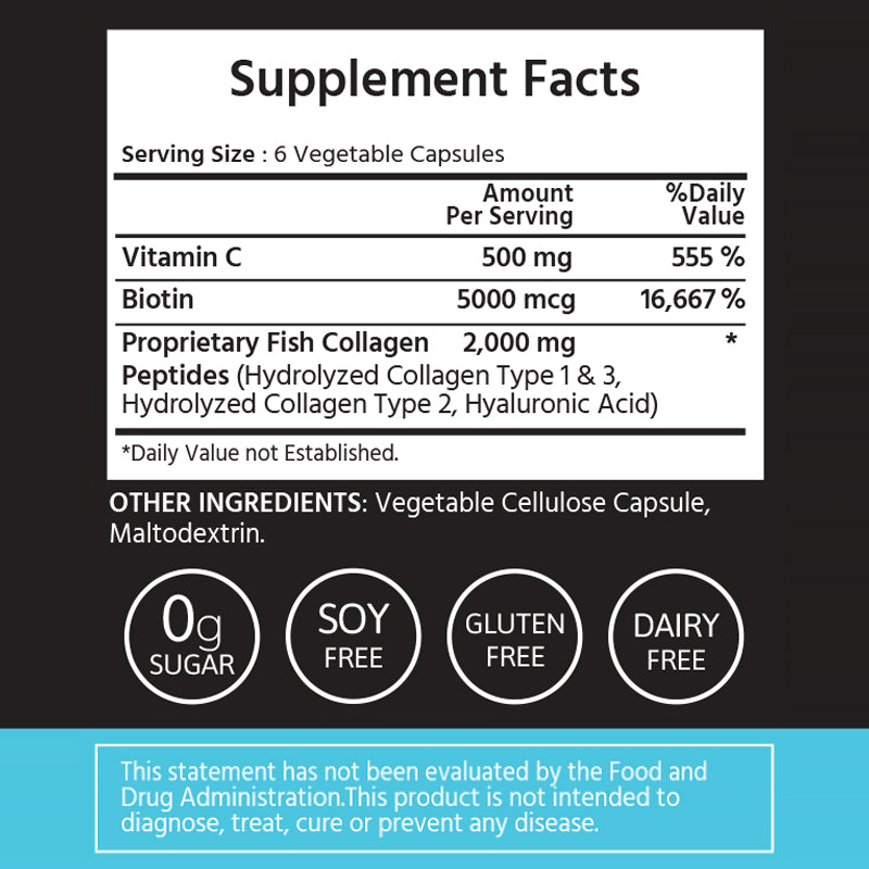 Collagen is a natural protein that is produced by your body, which is important to keep your bones, skin, joints, nails, and hair healthy. Among the many types of collagen offered, Marine collagen is the most effective, environmentally sustainable source of collagen. It is made with 100% wild-caught fish from certified, sustainably managed fisheries and formulated with vitamin C, biotin, and hyaluronic acid. The collagen protein is removed from the fish and broken down into smaller units of protein or collagen peptides, which offers high absorption.