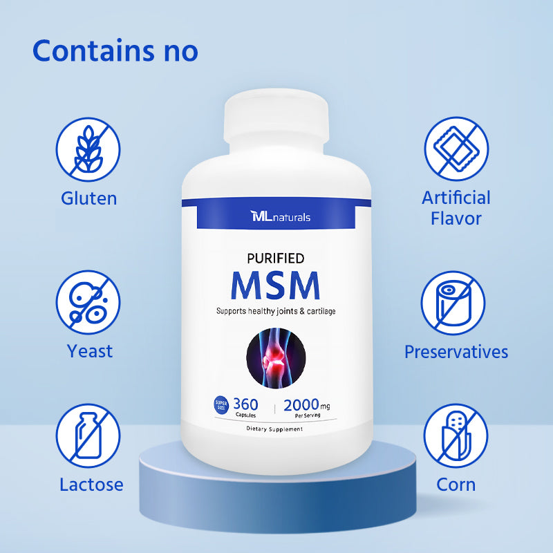 Methyl Sulfonyl Methane (MSM) is a chemical that occurs naturally in humans, as well as green plants and animals. It is known to help relieve joint pain, reduce inflammation and boost immunity. MSM also may help strengthen the immune system and is beneficial for producing keratin, a main component of skin, hair, and nails.